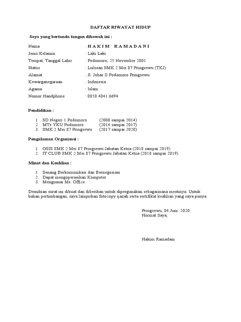 Daftar riwayat hidup adalah dokumen yang berfungsi untuk mengenalkan diri dan memberikan gambaran perihal latar belakang pelamar kerja pada pada suatu instansi atau perusahaan. Simaklah contoh cv daftar riwayat hidup tamatan sma atau daftar riwayat hidup siswa smk yang berikut ini. Sudah/belum pernah bekerja, tulis tangan, ketik, untuk lamaran di. Contoh daftar riwayat hidup tulis tangan lulusan smk merupakan surat penting pada pembahasan curriculum vitae menurut gawe cv.