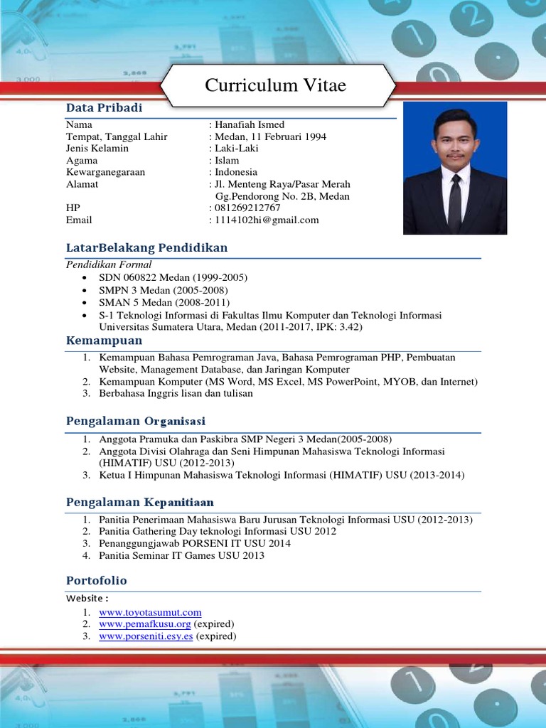 Pengalaman organisasi dan aktivitas sebagai relawan penting untuk kamu miliki dan cantumkan ke dalam cv. Contoh cv mahasiswa yang baru lulus. Curriculum vitae (cv) atau yang sering disebut dengan daftar riwayat hidup adalah sebuah contoh cv kreatif sebagai penguat surat lamaran kerja lengkap.