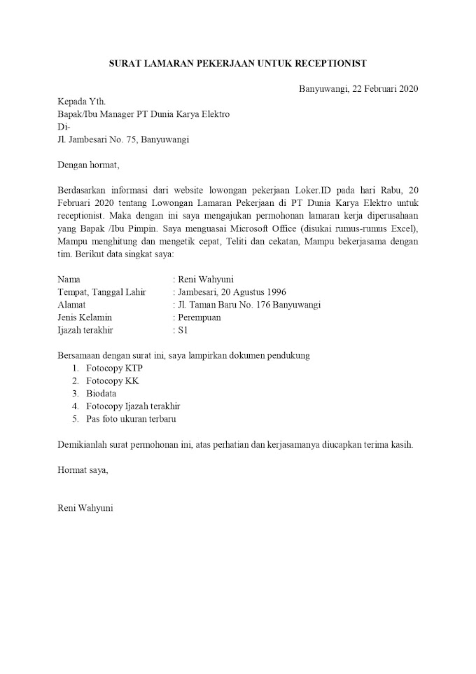 Contoh surat lamaran kerja magang. Contoh surat lamaran kerja di jne sebagai kurir. Contoh surat lamaran kerja fresh graduate. Daftar riwayat hidup (curriculum vitae).