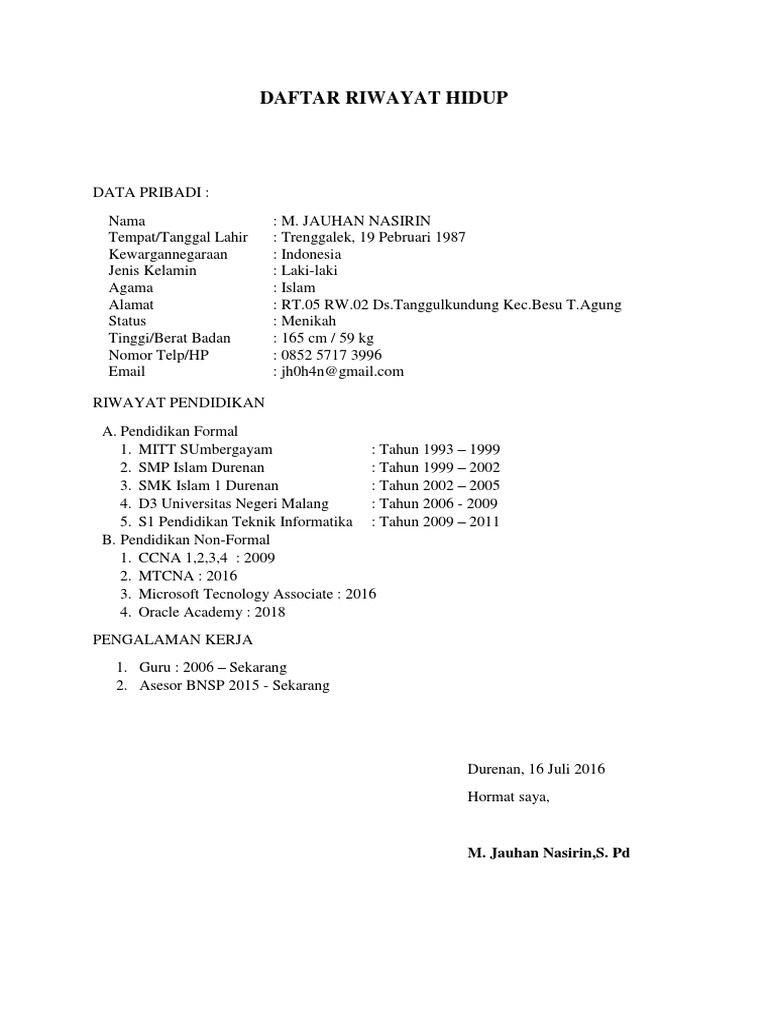 Sudah/belum pernah bekerja, tulis tangan, ketik, untuk lamaran di. Membuat daftar riwayat hidup sebenarnya merupakan hal yang mudah, namun bagi mereka yang belum pernah melamar pekerjaan atau bagi mereka lulusan baru (fresh. Cara mengisi daftar riwayat hidup sebenarnya tidaklah terlalu sulit, asalkan sesuai dengan format dan struktur daftar riwayat hidup yang baik dan benar. Daftar riwayat hidup yang dibuat baik dan benar akan memperbesar peluang untuk diterima bekerja pada perusahaan tersebut.